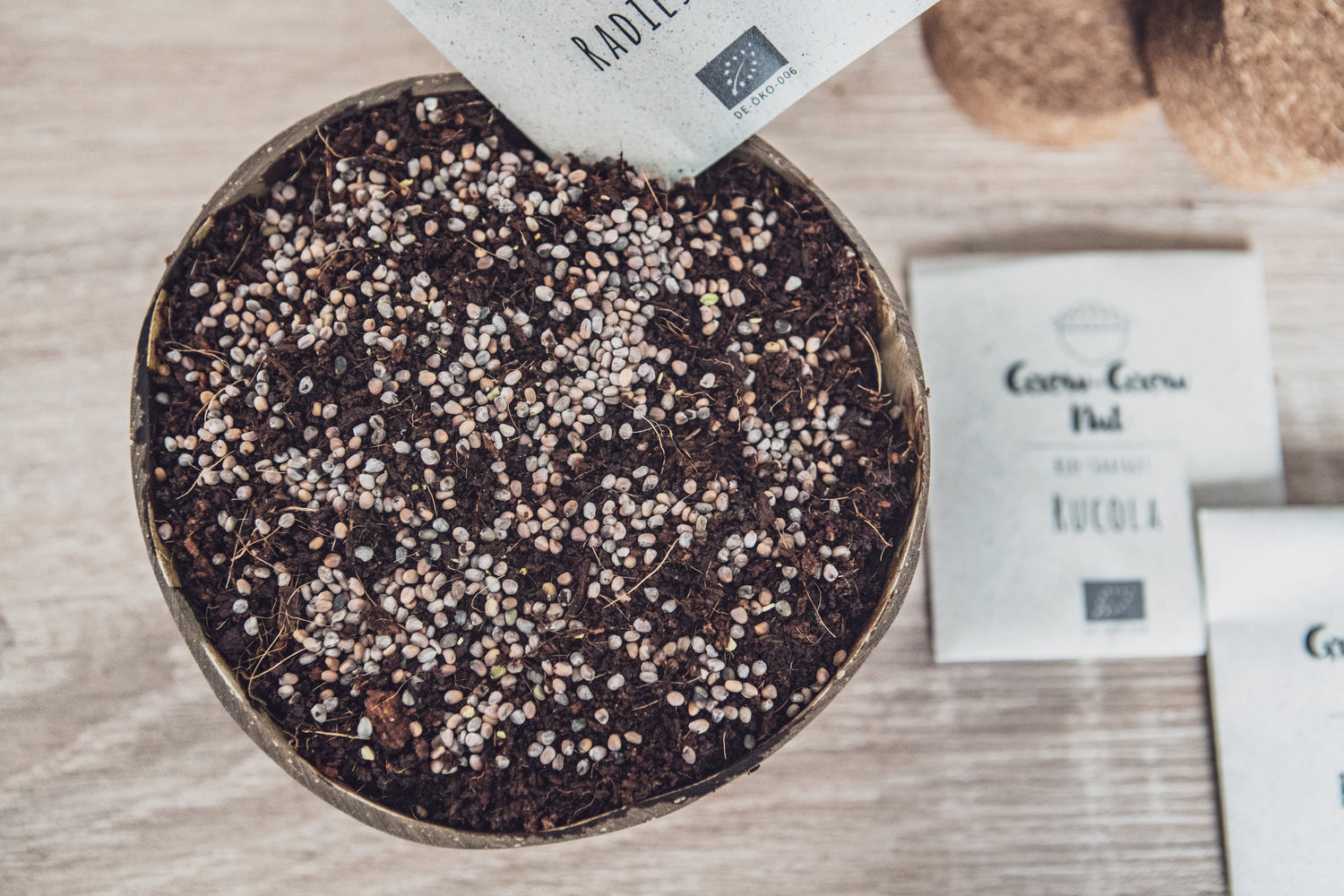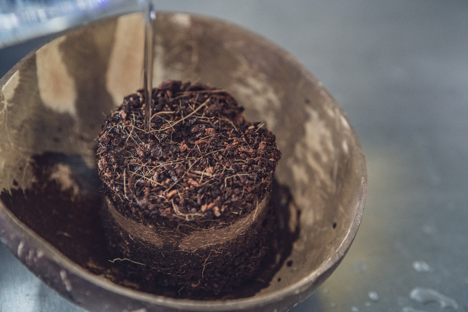 1. Einen Kokoserde-Ziegel in deine Grow-Grow Nut legen und bei leicht aufgedrehtem Wasserstrahl anfeuchten. Bitte immer nur kleine Wasserschübe dazugeben. Hinweis: Die Kokoserde-Ziegel sind in seltenen Fällen etwas stärker gepresst. In diesem Fall empfehlen wir, einen Ziegel in einem separaten Behälter mit 250ml handwarmem Wasser für 2-3 Minuten einzuweichen und die Erde danach gleichmäßig in der Grow-Grow Nut zu verteilen.