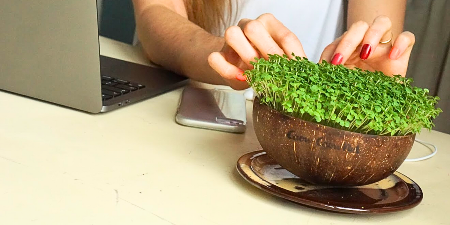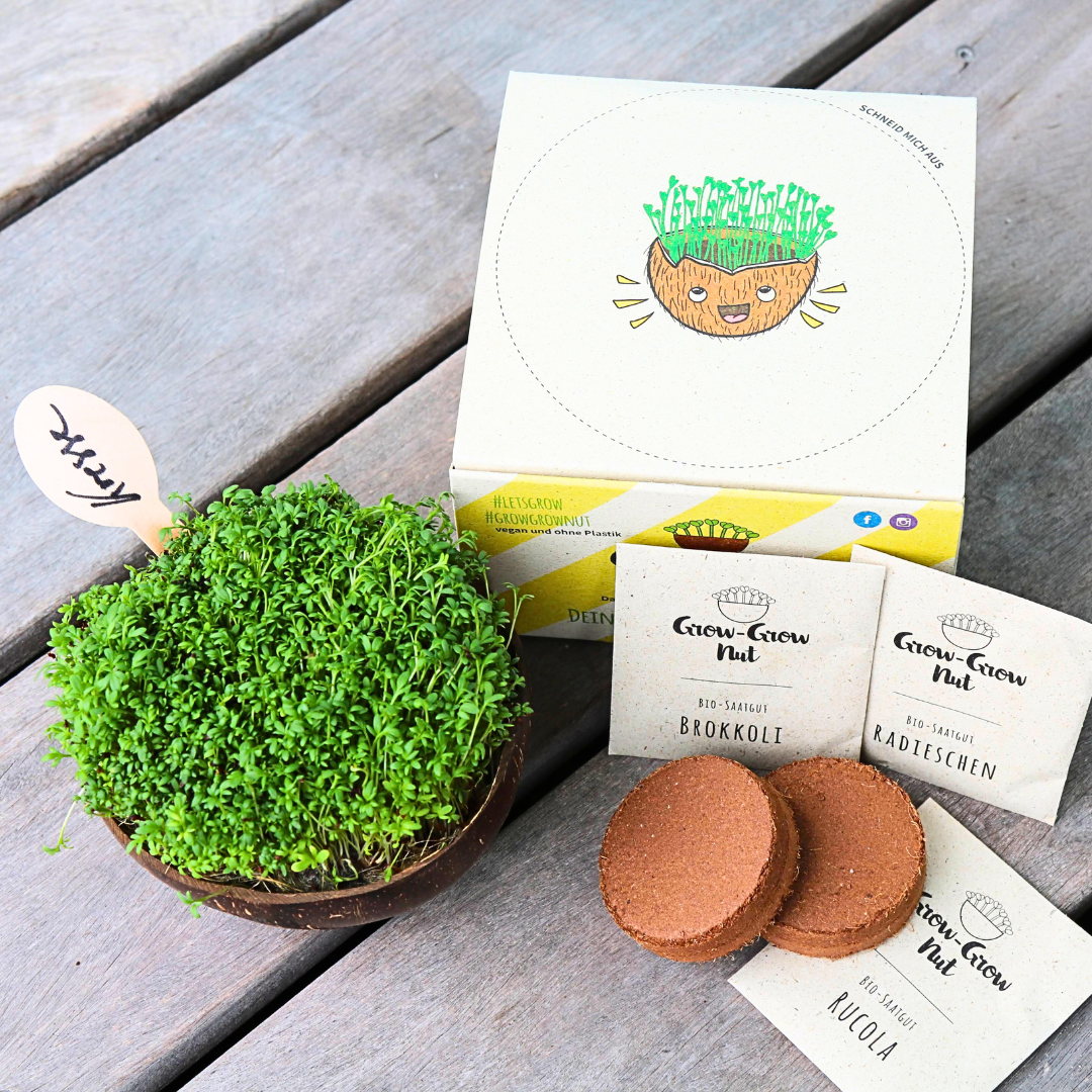Mit der Grow-Grow Nut verschenkst du ein plastikfreies, komplett biologisch abbaubares Microgreen-Anzuchtset mit einer echten Upcycling-Kokosnuss an deine Mitarbeiter oder Kunden.